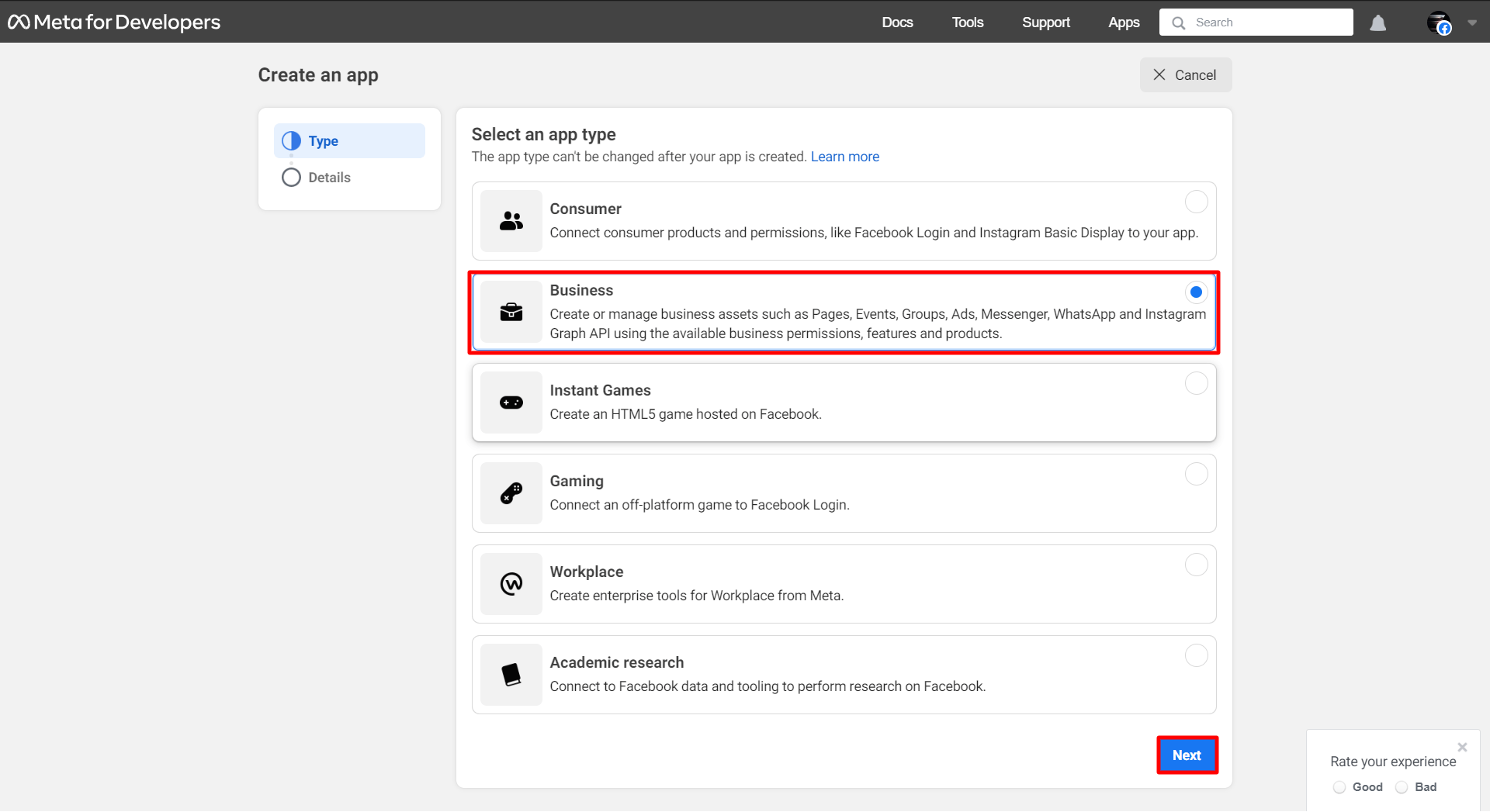 Instantly, a page called Create an App will appear with a list of app types. And from the list of app types, you have to select a type. Select Business as your app type. Then click on the next button.