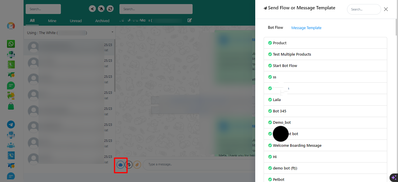 If you have multiple WhatsApp bot accounts connected, use the drop-down list to switch between them.